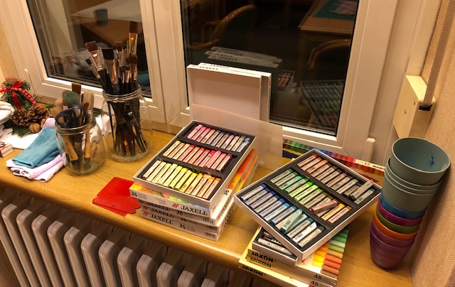 Mit ihrer Maltherapeutischen Ausbildung nach C.G.Jung überzeugte sie uns, Wachsmal- oder Pastellkreide und Guaschfarben in die Hand zu nehmen, auch wenn wir von unserem Maltalent nicht viel hielten.